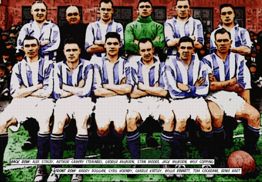 Back Row: Alex Stacey, George Milburn, Jimmy Potts, Jack Milburn, Wilf Copping, Tom Neal. Front Row: Harry Duggan, Tom Cochrane, Ernie Hart, Charlie Keetley, Billy Furness, Arthur Hydes. 1933-34