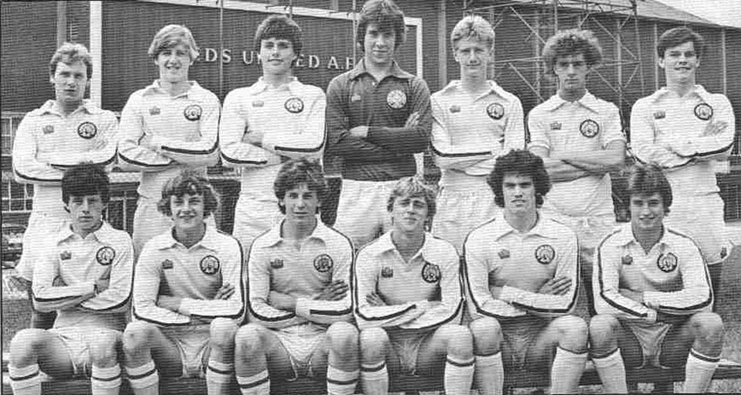 Back Row: Alan Curtis, Gary Hamson, Paul Madeley, John Hawley, Eddie Gray. Middle Row: Keith Parkinson, Paul Hart, David Harvey, John Lukic, Ray Hankin, Byron Stevenson. Front Row: Kevin Hird, Peter Hampton, Carl Harris, Trevor Cherry, Arthur Graham, Brian Flynn. 1979-80