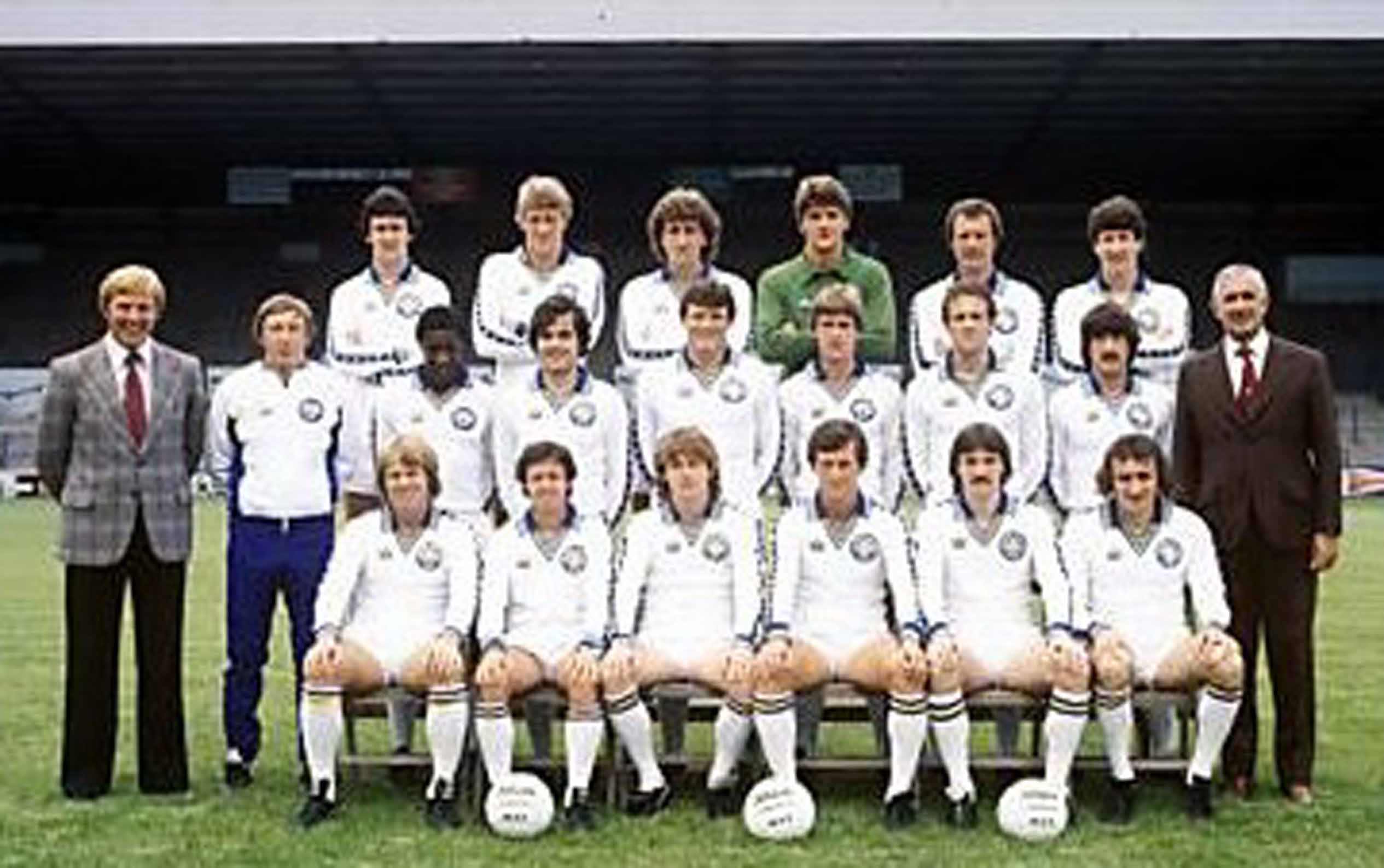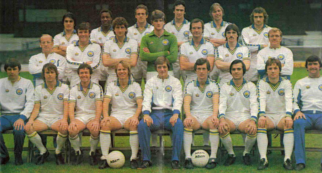 Back Row: Alan Curtis, Gary Hamson, Paul Madeley, John Hawley, Eddie Gray. Middle Row: Dave Merrington (Assistant Manager), Keith Parkinson, Paul Hart, David Harvey, John Lukic, Ray Hankin, Byron Stevenson, Syd Farrimond (Coach). Front Row: Carl Harris, Kevin Hird, Peter Hampton, Jimmy Adamson (Manager), Trevor Cherry, Arthur Graham, Brian Flynn. 1979-80: