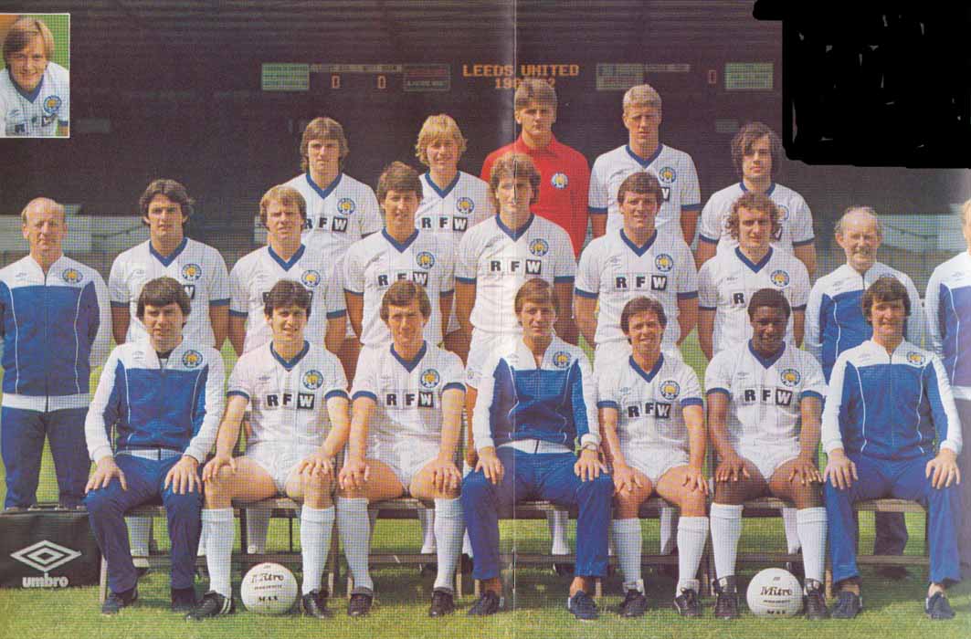 Back Row: Gary Hamson, Brian Greenhoff, John Lukic, Neil Firm, Alex Sabella. Middle Row: Geoff Ladley (Physio), Frank Gray, Arthur Graham, Derek Parlane, Paul Hart, Eddie Gray, Kevin Hird, Bob English (Physio). Front Row: Martin Wilkinson (Assistant Manager), Byron Stevenson, Trevor Cherry, Allan Clarke (Manager), Brian Flynn, Terry Connor, Barry Murphy (Coach). 1981-82: